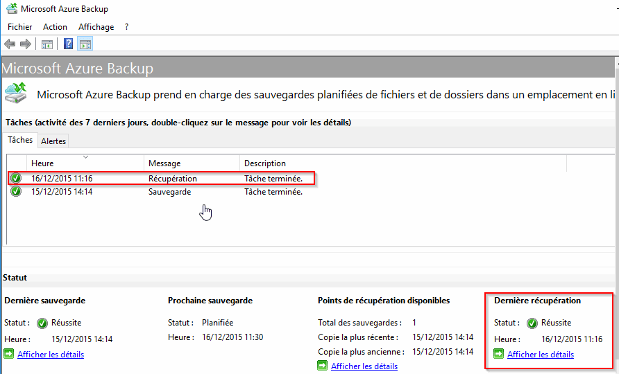 Allez vérifier sur la console d’Azure Backup, on peut voir qu’une tâche de récupération à était créée dans l’interface.